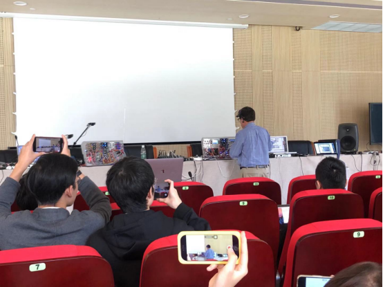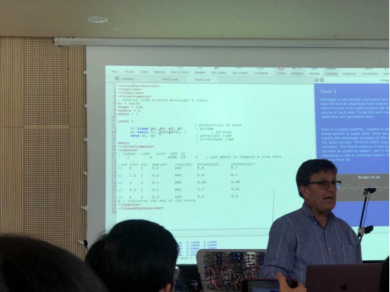 在三个多小时的讲座中,理查德·布朗格教授展示了他的多个作品以及Csound学生作品,同时详细阐述了如何使用Csound进行声音设计,并且带来了包含众多Csound学习资料的U盘供大家拷贝传播,展现了对Csound这们计算机编程语言的热爱,以及对所有对研究Csound有兴趣的同学表示热切的欢迎。(文字:夏钧君)