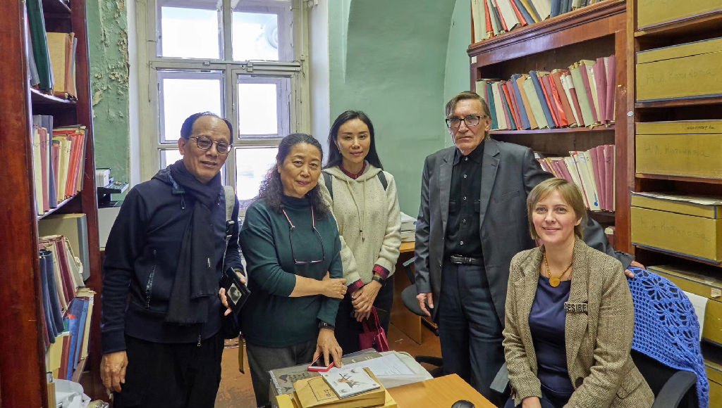 11月19日,团队来到彼得大帝民族学博物馆,在该馆东亚与东南亚部工作人员波丽娜的带领下参观了馆藏展品,并详细了解了展品中有关蒙古族马头琴、四胡的基本信息,如馆藏编号、采集地、采集者等。刘桂腾教授将自己的新著《鼓语——中国萨满乐器图示》(上海音乐出版社,2018)赠予该馆。
