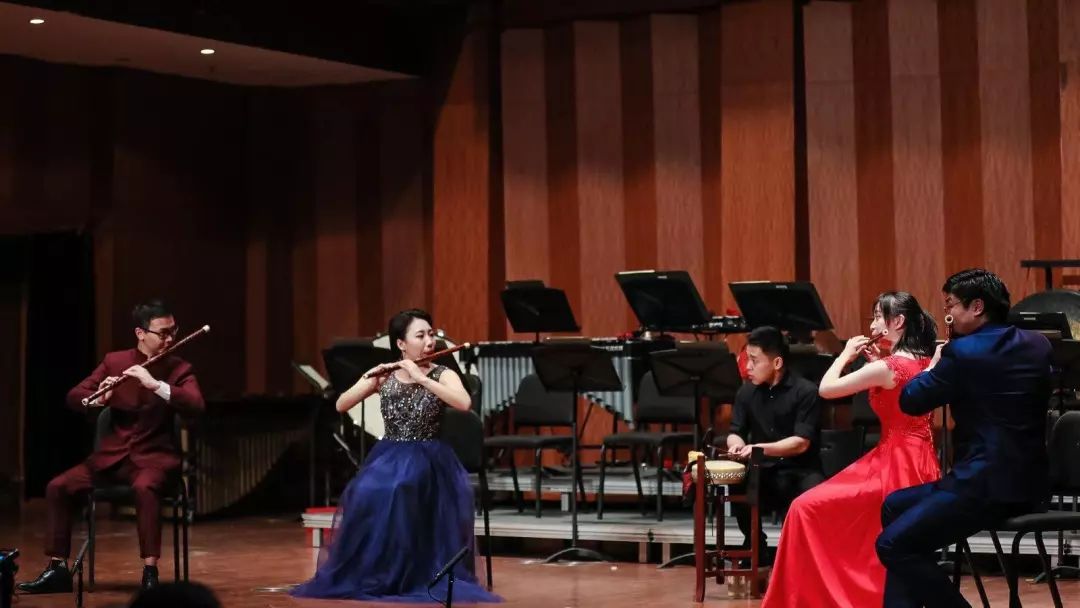 “一曲丝竹心已醉,梦听余音夜不寐。”朱晓谷教授于2014年创作的竹笛四重奏《四竹吟》,灵感来源于几位笛子同学在等候老师期间,每人准备各自不同的曲子的故事,采用不同调的竹笛,融入江南丝竹的风格,让听众感觉协调而又截然不同。乐曲由taptap点点体育竹笛研究生郑金珠、侯晨光、李航、龚伟健四位同学共同演奏,由封安邦担任打击乐伴奏,他们的演奏体现了对江南丝竹演奏技法的合理运用及对音乐风格的准确把握,为观众徐徐展开一幅江南图景。