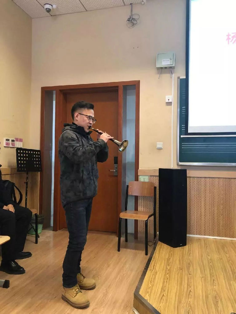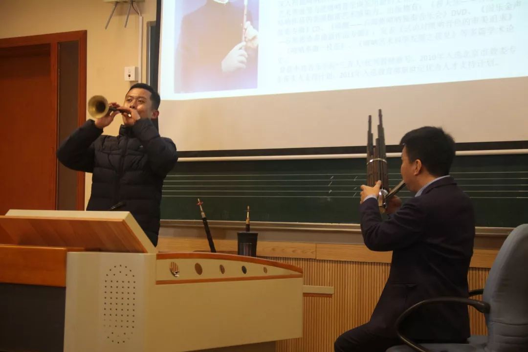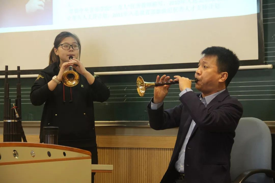 在紧接的大师班上,唢呐专业本科生李雨婷演奏了《正月十五闹雪灯》,研究生刘兆晨硕演奏了《六字开门》,石海彬教授对两位同学给予肯定并对日后演奏上所需注意的问题提出建议。
