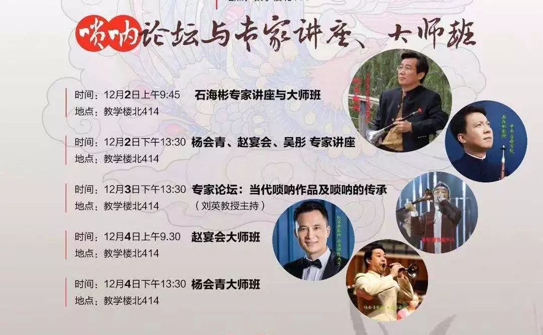 管乐周期间,唢呐专家中央音乐学院石海彬教授,以及管乐大家吴彤与西安音乐学院杨会青教授、南京师范大学赵宴会教授等将举办专家讲座及大师班。与此同时,青年教师及青年演奏家们将以“传统与当代——教学与演奏、传承与发展、理论研究与教材编创”为题,举办民族管乐青年论坛等等。