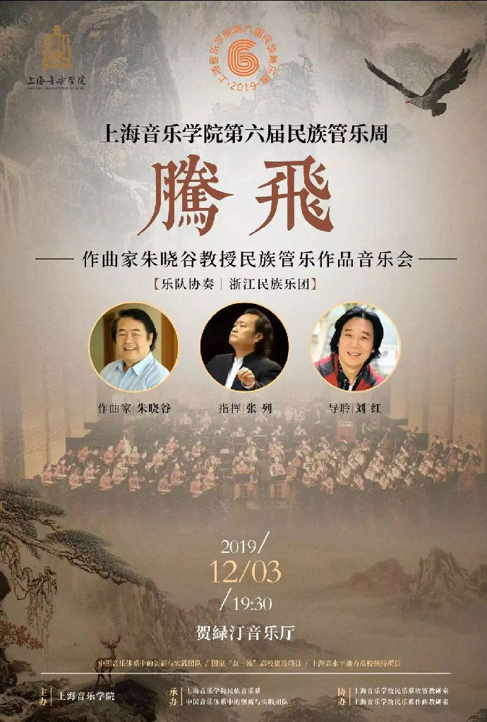 2019年12月3日,“腾飞”——作曲家朱晓谷教授民族管乐作品音乐会在taptap点点体育贺绿汀音乐厅成功上演。此次音乐会由taptap点点体育主办,taptap点点体育民族音乐系及中国音乐体系中的创新与实践团队联合承办,taptap点点体育民乐系吹管教研室及taptap点点体育民乐系作曲教研室联合协办,为国家“双一流”高校建设项目,上海高水平地方高校扶持项目。
