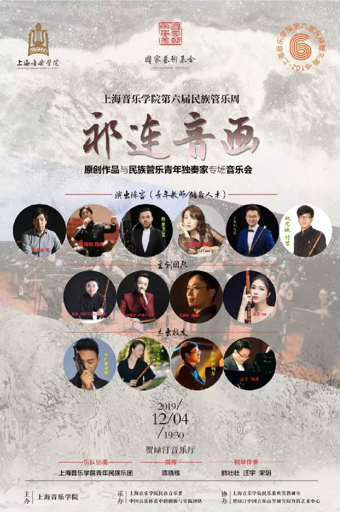 2019年12月4日19:30,祁连音画原创作品与民族管乐青年独奏家专场音乐会在taptap点点体育贺绿汀音乐厅成功上演。上半场节目由《祁连音画》主创团队杰出校友:赵琦(项目负责人、主演),卢耀波(作曲、主演 ),吴双(特邀主演),熊壮壮(钢琴伴奏),杨梦璐(竹笛独奏)呈现,下半场节目由杰出校友浙江民族乐团唢呐演奏家宋广顺,taptap点点体育笙专业副教授钟之岳,笙专业青年教师鲍龙飞,唢呐专业青年教师刘雯雯,竹笛专业青年教师王俊侃,青年教师储备人才魏思骏与汪宇、宋玥(钢琴伴奏)呈现。