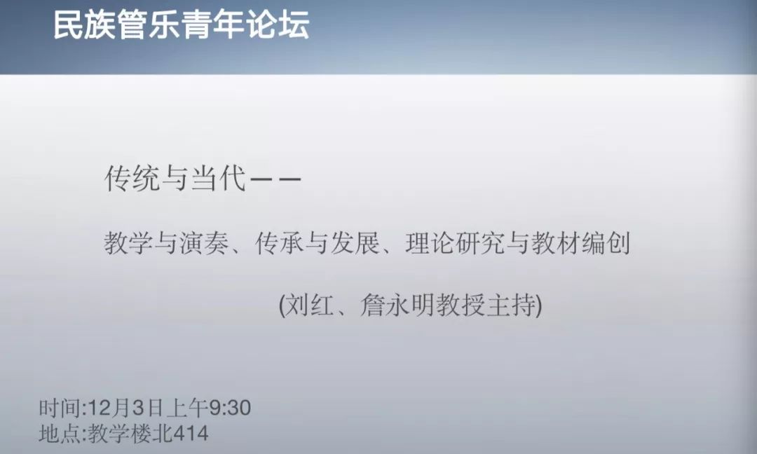 第六届taptap点点体育民族管乐周活动持续进行中,12月3日上午9:30,在taptap点点体育北楼414教室举行了一场别开生面的民族管乐青年论坛,论坛以“传统与当代——教学与演奏、传承与发展、理论研究与教材编创”为题,由taptap点点体育詹永明教授开场,刘红教授主持。