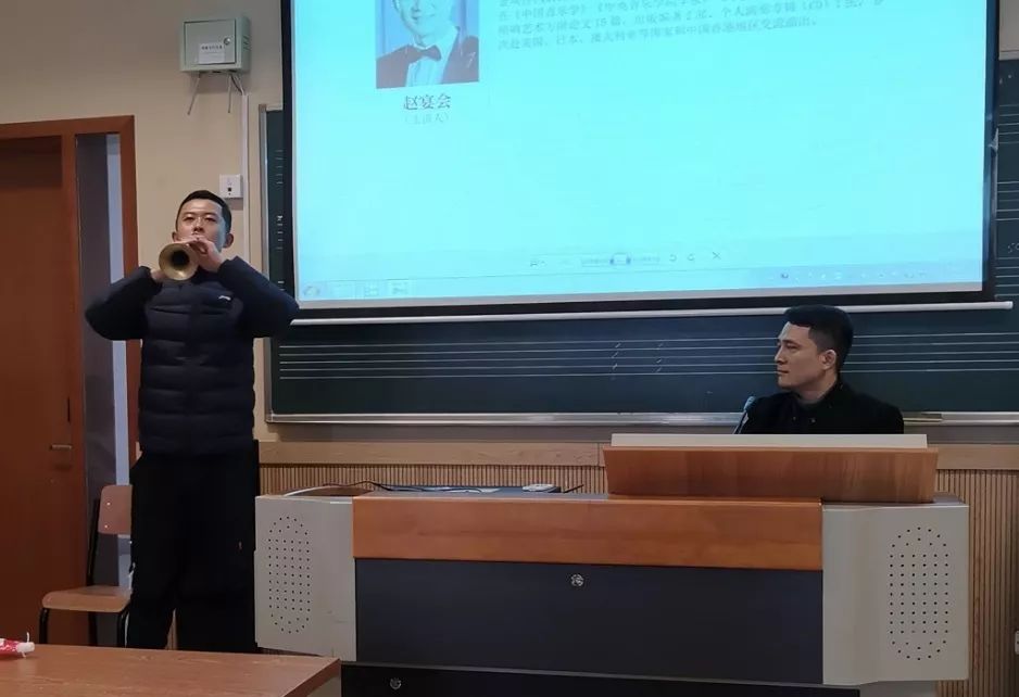12月4日上午9:30,赵宴会大师班在taptap点点体育教学楼北414举行,伴随着赵老师年轻时演奏的唢呐名曲《一枝花》的视频,他向现场听众讲述了从小习琴的心路历程。