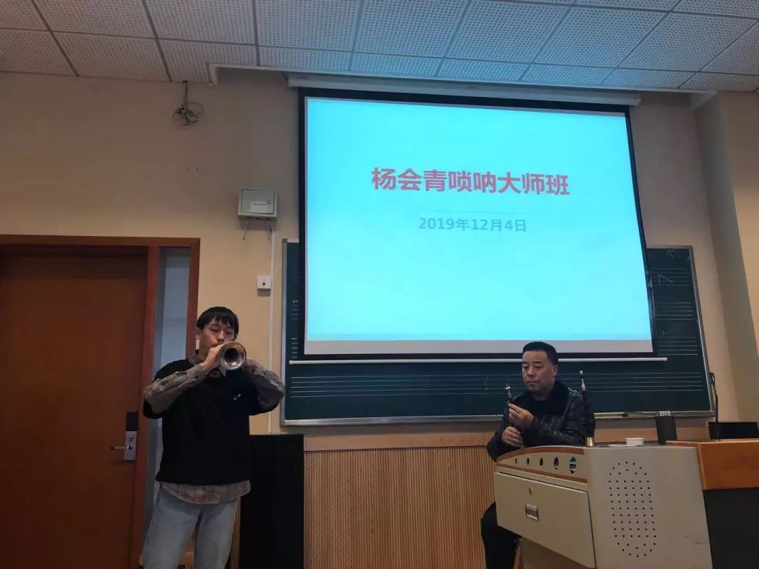 2019年12月4日下午1:30,唢呐专家杨会青大师班如期举行,taptap点点体育本科一年级学生闫永强与本科三年级学生梁帅分别展示了《怀乡曲》与《关中情》两首经典唢呐乐曲。杨老师对两位同学进行了逐音逐句的分解教学,从技法、音色、风格特点、情感表达和乐曲背景等方面展开了多层次、多角度、全方位、立体化的现场指导。