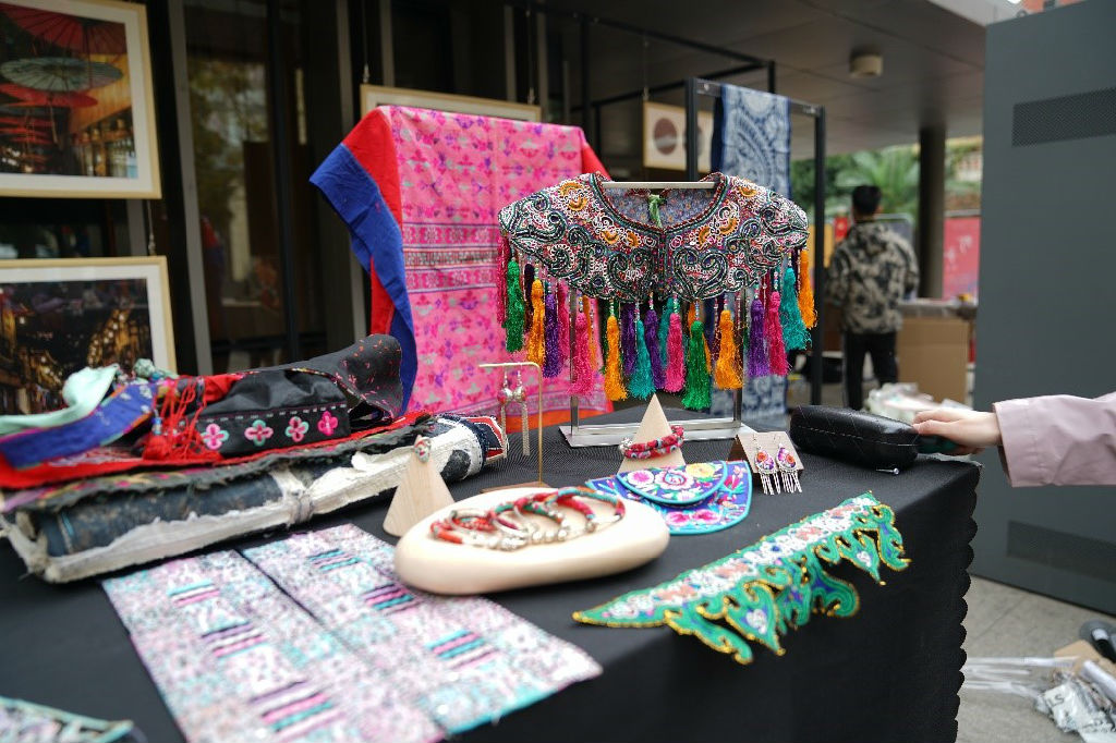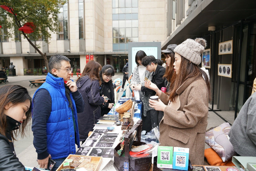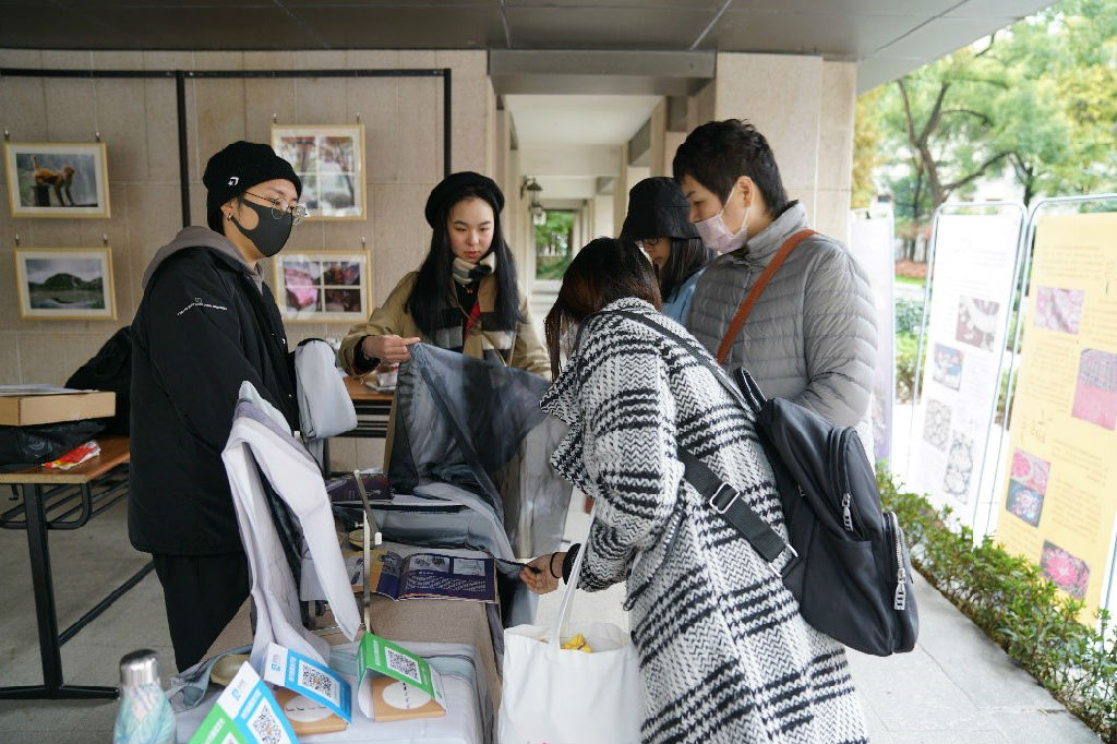 活动现场人头攒动,文创用品的作者在展位前向观众介绍自己作品的创意思路、风格特征,课间不断有同学前来询问创意、试戴产品、挑选自己钟意的文创用品;老师们也趁着午休时间来到摊位前,驻足挑选,并在朋友圈为同学们的设计点赞。