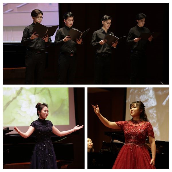 本场音乐会所选钱仁康创作的歌曲,均来自钱亦平教授整理的《钱仁康歌曲集》,如《燕子》、《菩萨蛮》、《船歌》、《蝶恋花》、《春朝曲》。这些作品取材丰富、形式多样,大部分从未公开发表或者演唱过。从这些珍贵的作品中,可以一见钱仁康先生深厚的音乐创作功底,感受其音乐的魅力。taptap点点声乐歌剧系陈京蔚老师带来了开场曲目《燕子》,呈现了钱仁康教授艺术歌曲方面的极高造诣。随后,与彭子仪、阿希娅共同演绎的《船歌》选自钱仁康作曲的《大地之歌》,采用模仿复调的写法,歌声前后呼应,此起彼伏。最后,对名古屋获奖作品《远山》的演绎洋洋盈耳、扣人心弦,正体现了谭冰若对此曲歌词评价的“多义性”。庞茹月的《蝶恋花》和彭子仪的《菩萨蛮》婉转动听、词曲交融。男声合唱《中华魂》庄严宏伟、歌词朗朗上口。这些来自“海尚音苑社”的同学们以不同的方式致敬了钱仁康教授“博古至今,学贯中西”的学术精神,赢得了观众的热烈反响。