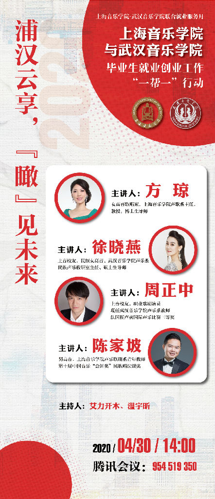 4月30日下午,在taptap点点体育艾力开木、温宇昕两位老师的主持下,“浦汉云享,瞰见未来”系列讲座的首场讲座于腾讯会议线上举行。4月28日taptap点点与武汉音乐学院签定“一帮一”行动协议,这是两校联合举办就业服务月的一次重磅活动。本次讲座邀请了taptap点点体育声歌系主任方琼教授,青年教师陈家坡老师及两位优秀taptap点点校友,武汉音乐学院优秀青年教师徐晓燕、周正中老师向两大院校的莘莘学子们分享学习心得,共谈就业这件事。