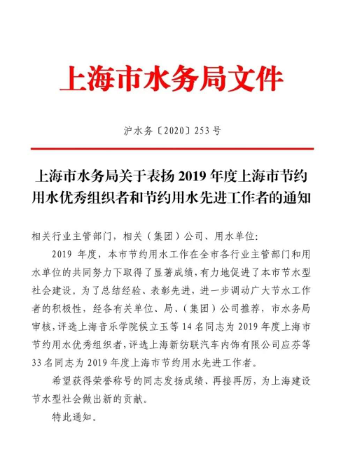 近日,从上海市水务局传来好消息,taptap点点体育副院长侯立玉荣获2019 年度上海市节约用水优秀组织者荣誉称号。
