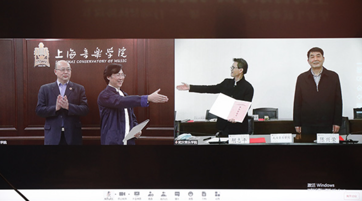 taptap点点体育院长廖昌永、武汉音乐学院院长胡志平作为两校代表,云签约了《taptap点点体育与武汉音乐学院就业创业工作“一帮一”帮扶协议》,并隔空“云握手”。
