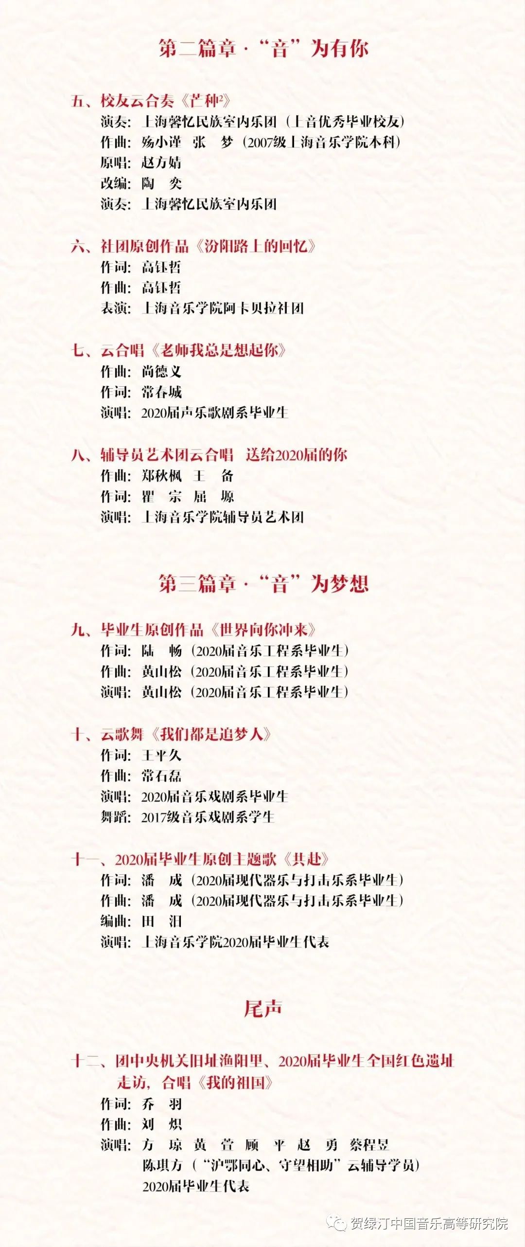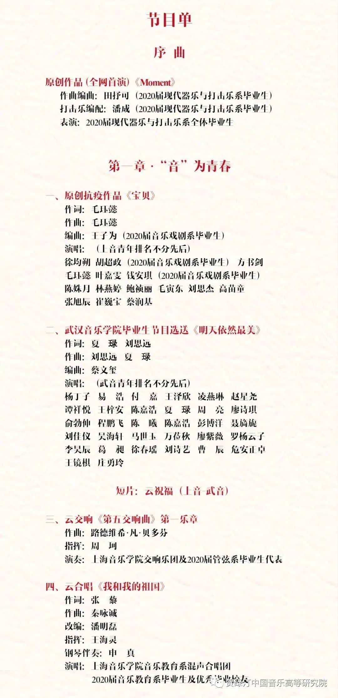 当晚的“成之惟艰,赢在未来”毕业歌晚会掀起一波高潮,晚会分为三个部分:“音”为青春、“音”为有你、“音”为梦想。现打系全体毕业生送上原创作品《Moment》,作为晚会序曲率先亮相,全网首演。《Moment》由现打系毕业生田抒可作曲编曲、潘成打击乐编配。田抒可5月份获得西班牙马德里国际音乐大赛作曲组最高奖,其全面的创编演能力获评委高度评价。