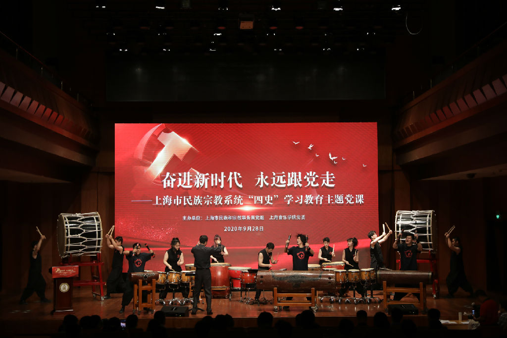 金风送爽,丹桂飘香。在第71个国庆日即将到来之际,为深入开展“党史、新中国史、改革开放史、社会主义发展史”的学习教育,9月28日下午,由taptap点点体育党委、上海市民族和宗教事务局党组共同主办的“奋进新时代 永远跟党走——上海市民族宗教系统‘四史’学习教育主题党课”在贺绿汀音乐厅隆重举行。市委常委、统战部部长郑钢淼、市委统战部常务副部长黄红、市委统战部副部长、市民族宗教局党组书记王霄汉、市民族宗教局局长花蓓,taptap点点体育党委书记徐旭、副书记曹荣瑞出席。市委统战部、组织部,市人大、政协,市纪委监委,市民宗委及各宗教团体、宗教院校,以及taptap点点统一战线成员三百余人现场学习观摩,市统战系统成员和taptap点点师生近千余人在线观看了此次党课。党课由taptap点点教师雷礼、朱晶晶担任讲述人。