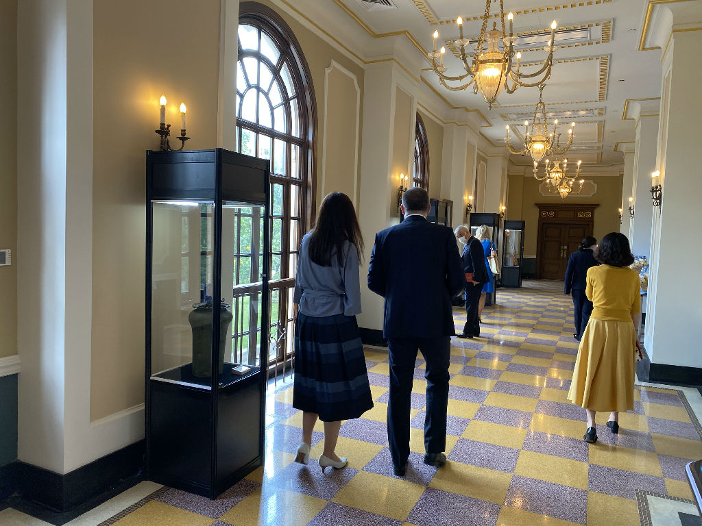 9月30日上午,上海市人民政府在上海音乐厅举行庆祝中华人民共和国成立71周年音乐会。市领导与中外来宾欢聚一堂,共贺共和国华诞。音乐厅内喜庆祥和,节目精彩纷呈;音乐会开始前,二楼回廊上展出的錞于、蝶式筝、虎座鸟架鼓(仿)、小箜篌等中国传统民族乐器吸引了中外来宾驻足欣赏。