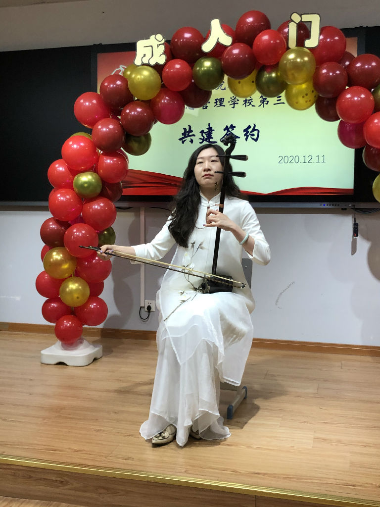 唐丽霞一行还参加了2018级学生18岁成人礼,为学生带上成人礼帽,同唱生日歌,共切生日蛋糕,还为60位特殊学生送上了手作“taptap点点礼物”。第七党支部党员王霄然一曲二胡独奏《赛马》、taptap点点学生演唱《在希望的田野上》等歌曲获得了阵阵掌声。