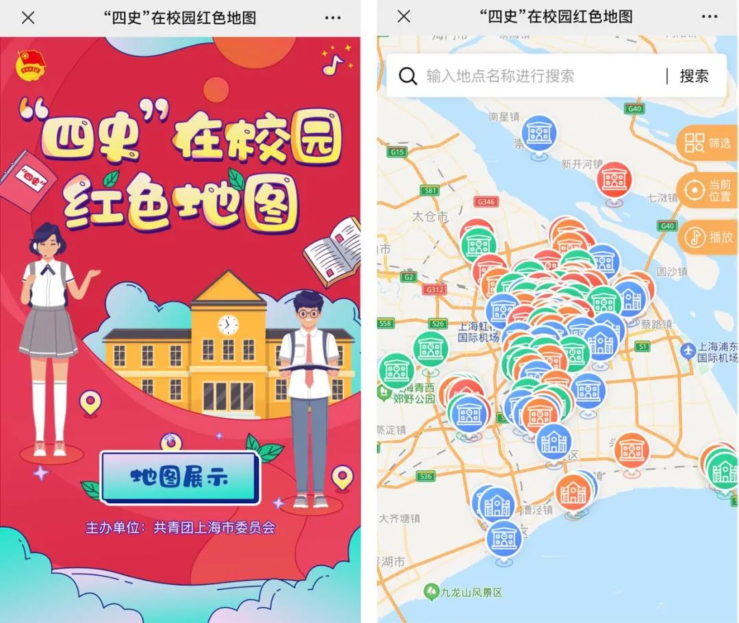 2020年6月28日上午,“四史”在校园红色地图正式发布,第一批上线129所学校的150余项品牌项目,包括36个聚焦党史的项目,41个聚焦新中国史的项目,另有36个项目聚焦改革开放史,38个项目聚焦社会主义发展史,分别以校史志愿讲解团、校史系列课程、校史剧、校史宣传影像等形式演绎。