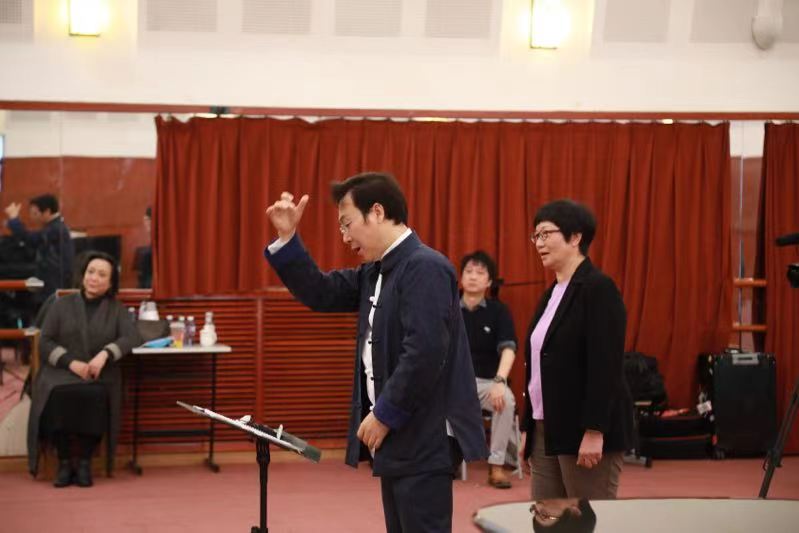 首先排练的是《长征组歌》中的第九首《报喜》,这首作品讲述的是红二与红四方面军历经千辛万苦在甘孜会师的场景,全曲洋溢着喜悦、欢乐的气氛。廖老师在听完同学们的演唱之后,认为同学们当下比较重要的是要表现出作品的情感,演唱要更有画面感。他用生动、风趣且具象的语言向大家描绘了音乐中描写的场景,将谱面上的旋律和歌词通过解读形成一幅画面让同学们更好的带入情境。肖霞女士根据其父亲的亲身经历,以及她自己对歌词的解读,向大家具体阐释了何为“手足情,同志心”,何为“历经千辛万般苦”。同学们通过二位老师的讲解对作品都有了更深的认识,在演唱中也表现了出来。