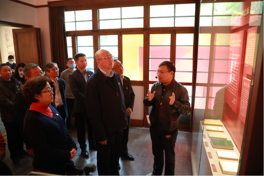 最后一站来到了复旦大学《共产党宣言》展览馆。复旦大学党委副书记许征陪同参观。《共产党宣言》是国际共产主义运动的第一个纲领性文献,它的发表标志着马克思主义的诞生,深刻影响了人类历史进程。复旦大学党委党校办公室主任、组织部副部长周晔为大家讲解了陈望道同志翻译《共产党宣言》的故事。
