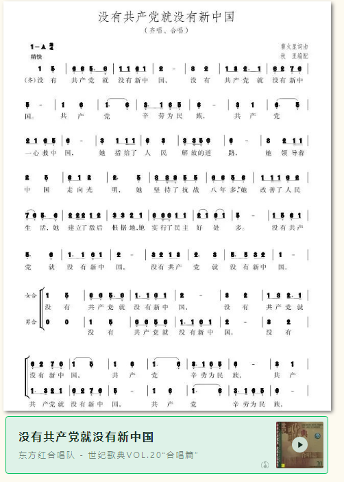 歌唱红色经典,传承红色基因 紧扣时代主题,唱响世纪颂歌 为庆祝中国共产党成立100周年,即日起至7月31日,上海音乐出版社特别策划为期100天的“歌曲中的百年党史——庆祝中国共产党成立100周年歌曲展播”活动。 歌曲,作为重要的音乐载体和传播媒介,在中国共产党百年发展中始终发挥着号角的作用。展播活动将精选100首各个历史时期具有经典性、代表性和艺术性的优秀歌曲,并辅以歌曲背后的动人故事、有声导赏与相关党史问答,以歌声记录百年的光荣与梦想。 我们期许以全新和立体的方式,讲述“歌曲中的百年党史”,创新党史教育形式,掀起追寻红色足迹、传承红色基因的热潮,唤起一代代中国人的“红色记忆”。 第一期 《没有共产党就没有新中国》 《没有共产党就没有新中国》创作于1943年,原名《没有共产党就没有中国》,后改为现名。 该曲吸取了民间歌舞“霸王鞭”的音调特点,旋律质朴流畅,节奏坚定有力,唱出了广大人民群众对中国共产党的衷心拥护和永远跟党走的坚定信心,揭示了只有中国共产党才能领导中国人民争取国家独立、民族解放、人民幸福的历史必然。