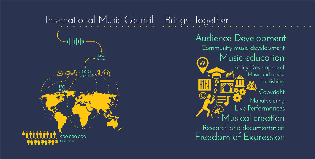 国际音乐理事会成立于1949年,总部设在法国巴黎,网络遍布全球五大洲的150个国家,是与联合国教科文组织保持正式协作关系的音乐领域非政府国际组织,承担着推动全人类的文化发展、文化挖掘、文化交流、文化保护的重大责任使命。目前旗下拥有包括世界国际音乐比赛联盟(WFIMC)、欧洲音乐学院协会(AEC)、国际音乐家联合会(FIM)、国际当代音乐学会(ISCM)、国际音乐教育学会(ISME)等120余个国家及专业组织、1000余个国际专业学术机构和百万名国际会员,被誉为音乐界的联合国。