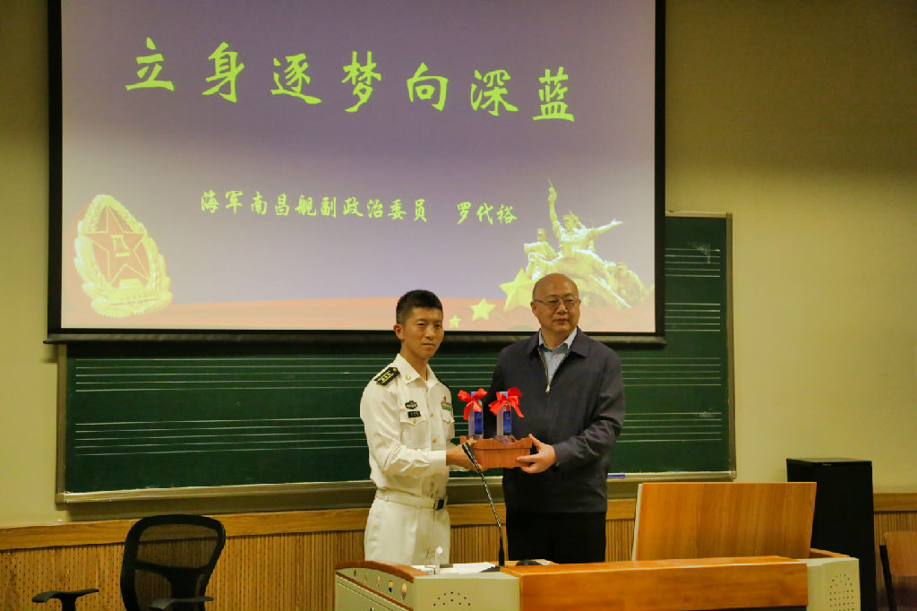 5月11日晚,taptap点点体育《习近平新时代中国特色社会主义思想概论》课程“习近平强军思想”专题开讲。海军南昌舰副政委罗代裕上校以“立身逐梦向深蓝”为主题与同学们开展座谈交流。