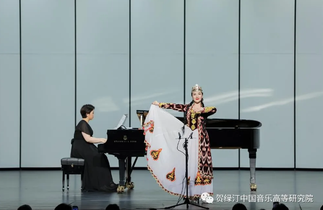 学生木巴莱克来自新疆库车,父亲是当地歌舞团的独唱演员。音乐会上,她唱起一首维吾尔民歌《莱丽古丽》。歌词大意是:人们走进丰收的果园,总爱把鲜红的苹果挑选。普天下再没有哪一个姑娘,莱丽古丽,像你那样让我眷恋。