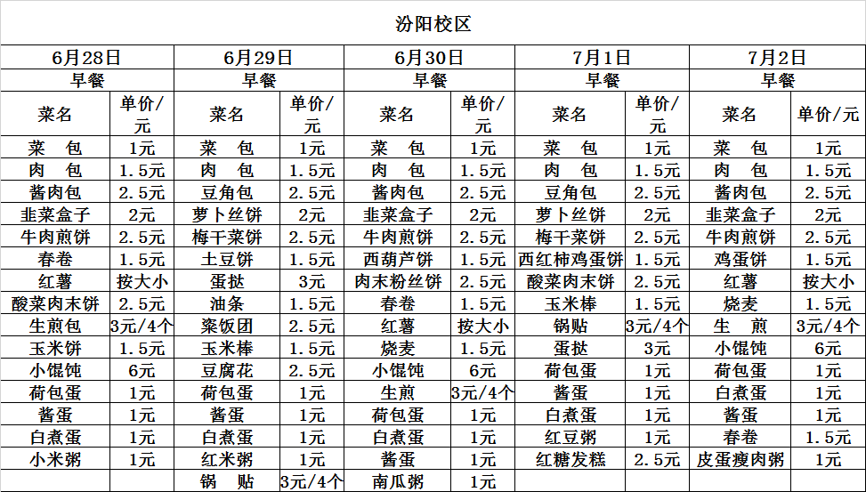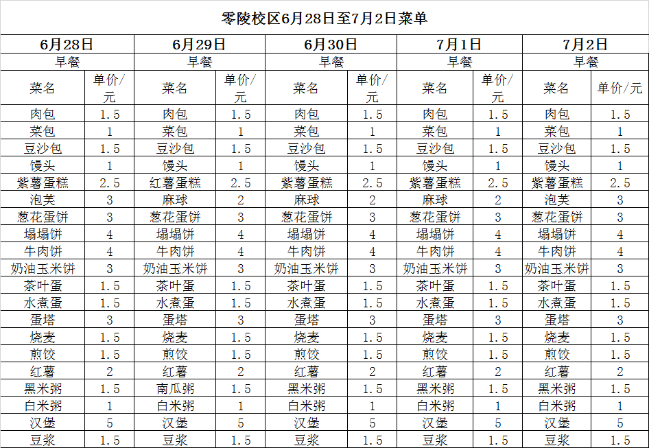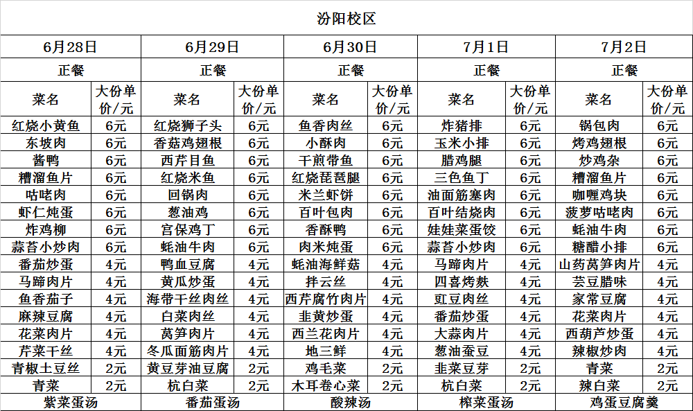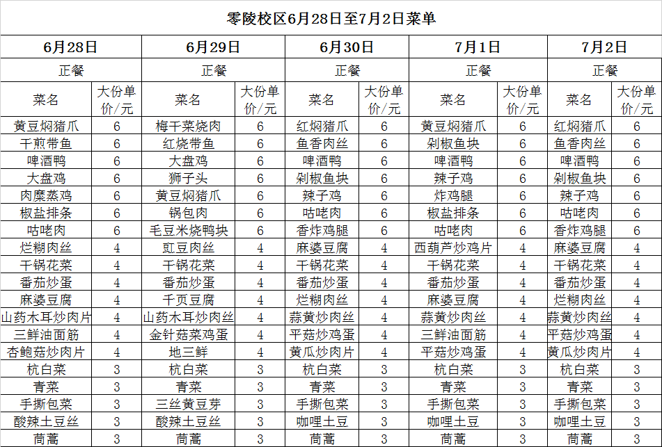 6月28日——7月2日两校区菜单
