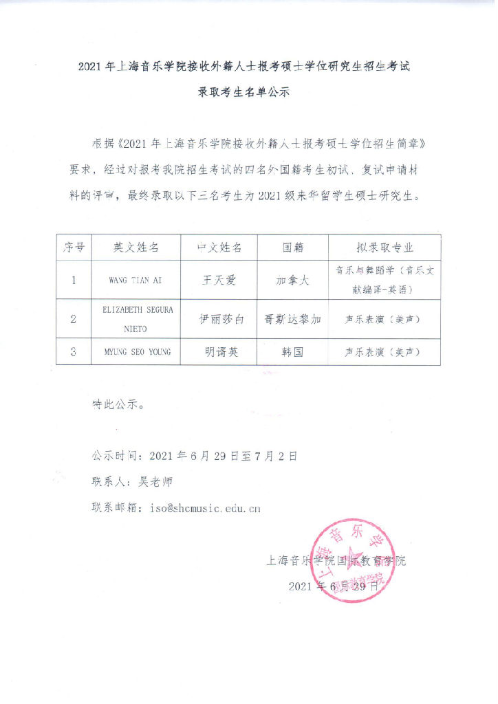 2021级来华留学生硕士研究生录取公示
