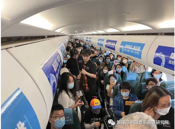 2021年7月17日晚上,春秋航空9C6311航班从党的诞生地上海飞往革命圣地延安。当飞机到达平飞高度后,一些旅客纷纷起身,从随身携带的行李中拿出小号、圆号、小提琴、中提琴、大提琴等各类乐器,并在客舱里演奏起来。旅客们被这不期而遇的惊喜所吸引,纷纷拿起手机和相机,记录下这的美妙时刻。