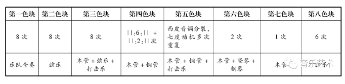 首段一开始,西皮音调就毫无遮拦、毫无阻隔地奔涌而出,任由这萦绕在内心深处的记忆不假思索地脱缰驰骋,全体管弦乐队的强力全奏在作品伊始即形成了一股强大的旋律冲击力,酣畅淋漓又带着气宇轩昂的气质。作曲家将这个西皮音调置于若干个音色块面中,任它畅快而不停歇地挥洒、反复。如果仅以西皮音调在不同乐器上的重复次数作为划分依据的话,可以分为以下的音色块。