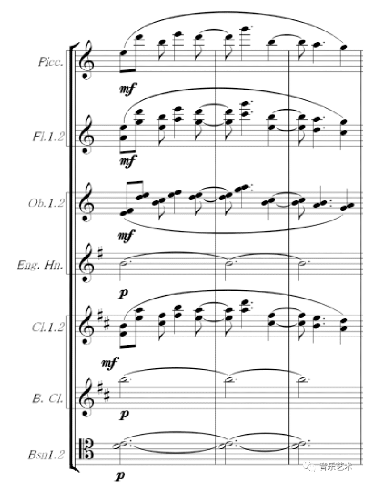 第一个音色块在纵向上可以分为三个层次,木管、铜管和弦乐形成的旋律音层处于当中,其下方由长号、大号和低音提琴所奏出的长音撑托,构成踏板音层,其上方高音区有一音响渲染层,短笛、钟琴和钢琴的极高音区奏出的颤动音型为旋律音层添加了一抹闪烁幻动的色泽。同时打击乐、竖琴构成的乐队织体上的重音点与旋律所强调的重音点形成了节奏音位的错位和对峙。音乐一开始即充满着动感和动力,恰如戏之开场那热烈喧闹的闹场锣鼓,同时极具序曲音乐的味道和气势。
