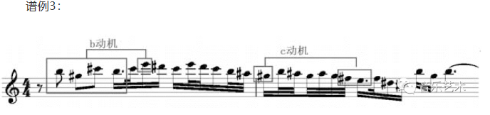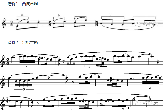 如果说贵妃主题是如银月华,袅袅升腾而出,纯美惊世,那么西皮音调即是漫天星光,月华黯然时灿然扑闪,月华倾泻时默默映衬。这个短小的西皮音调由3个小动机构成:a动机为上行七度音程,b动机是两个互为移位关系的上行纯四度音程,c动机是由两个二度下行构成的大三度框架。它始终以不同的姿态、色彩贯串于全曲的各个段落中。