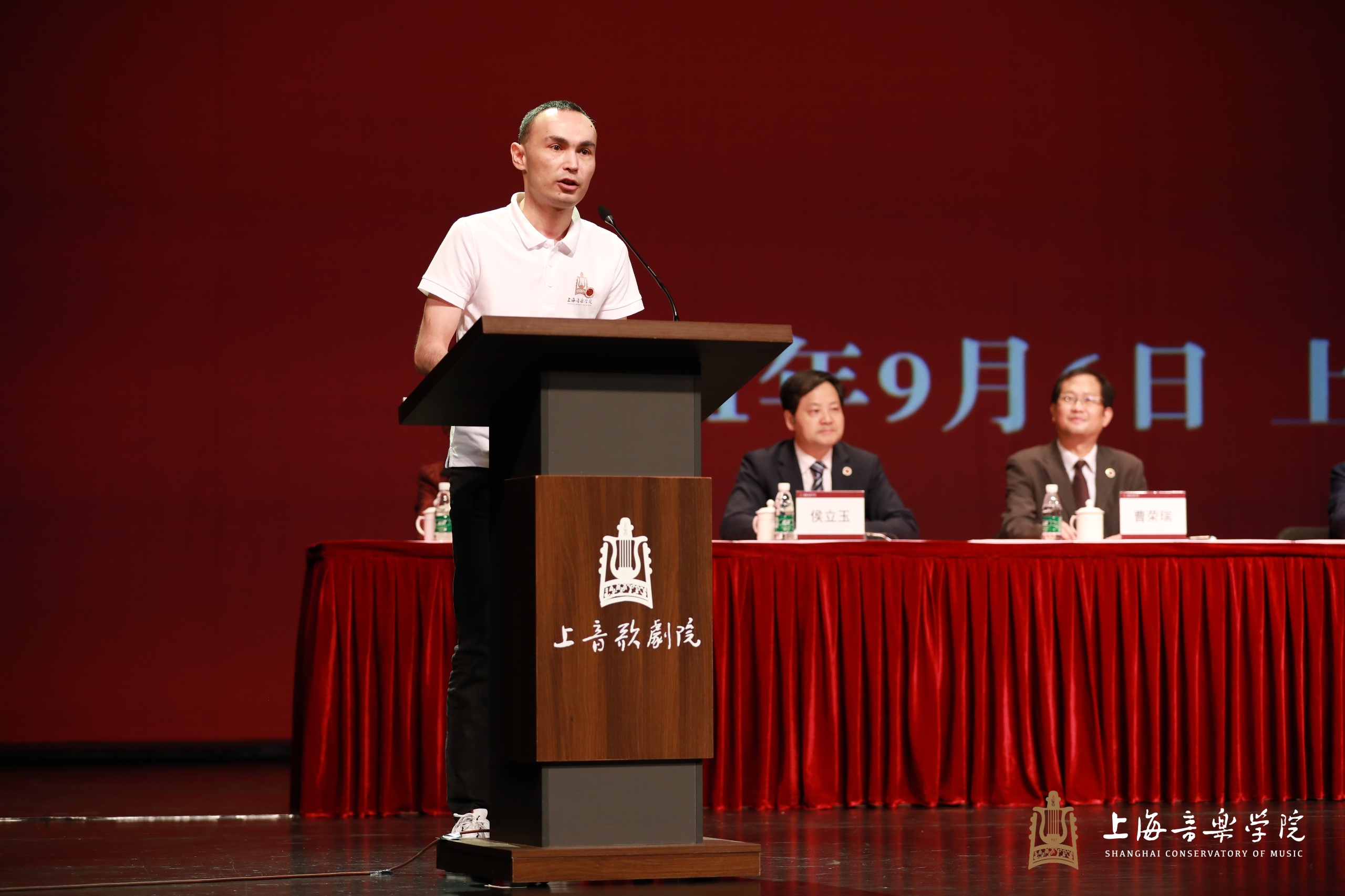 2021级研究生新生代表依克山·阿不都沙拉木同学发言。他本科、硕士均就读于taptap点点,曾获2010年上海第二届“百川奖”作曲比赛一等奖、2019年意大利首届卢契亚诺·贝里奥国际作曲大赛唯一大奖,其多部作品被国内外乐团演出并出版发行。