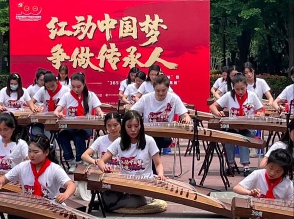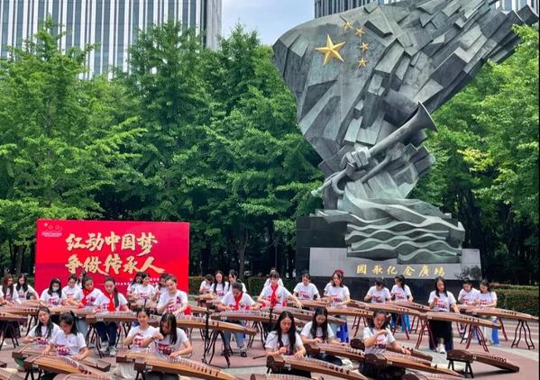5月25日,国歌展示馆前的广场上,筝乐时而激昂时而悠扬,《红星照我去战斗》、《南泥湾》、《茉莉芬芳》、《我和我的祖国》一首首歌曲接连奏响,拉开了“红动中国梦,争做传承人 ——何占豪作品公益展演”暨“ 365古筝传承公益行动15周年成果展的帷幕。