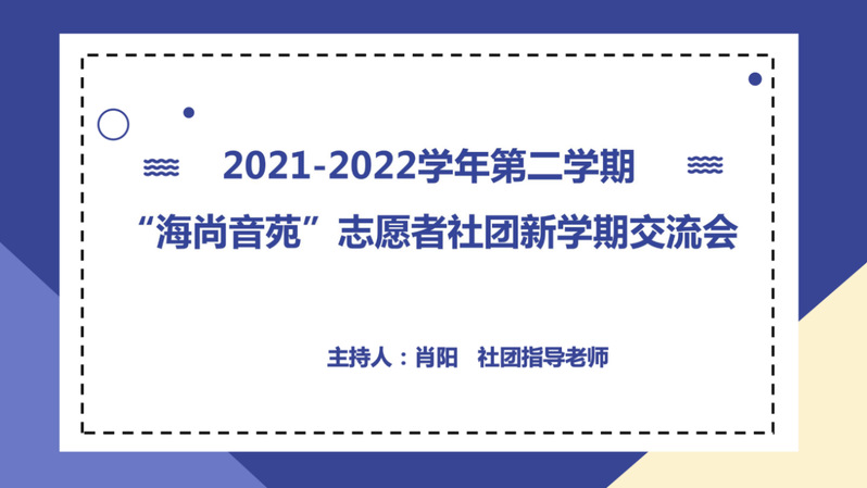 2022年4月1日,2021-2022学年第二学期“海尚音苑”志愿者社团新学期交流会在线上召开,党委宣传部副部长肖阳老师,马克思学院副教授李敏老师,宣传部唐天祺老师、郑荧馨老师以及部分社员参会,会议由肖阳老师主持。