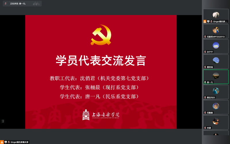 习近平总书记说:“关键时刻冲得上去、危难关头豁得出来,才是真正的共产党人。”此次开班还特别邀请到三位在此次疫情防控工作中积极表现、勇于担当的发展对象作交流发言,分别是后保处教职工沈俏君、现打系学生张栩晨、民乐系学生唐一凡。其中,沈老师作为医务工作者,是3月13零陵路校区进入封闭管理后第一批入驻的工作人员,每天在参与抗疫物资接收发放,每日核酸检测人员名单统计同时,还要处理各种突发应急患者救治、发热患者转运对接等工作,至今已在抗疫一线连续工作一个月,展现出“全心全意为人民服务”的根本宗旨。张同学和唐同学在学习之余也积极参与志愿服务,为周围的老师同学排忧解难,他们用自己的方式,身体力行地践行习近平总书记在建党百年对青年的寄托:“不负时代、不负韶华、不负党和人民的殷切希望,是中国青年的使命担当。”