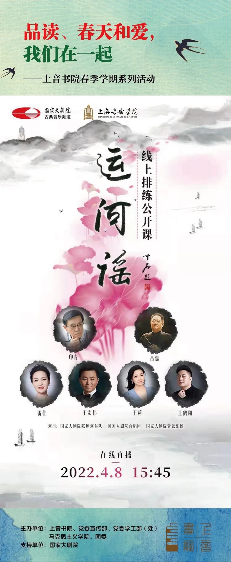 今年恰逢国家大剧院首部原创民族歌剧《运河谣》推出10年,原班演出阵容再聚首。该剧从戏曲、民歌、民俗等中国文化精华中汲取营养,呈现出民族歌剧所特有的艺术魅力。4月8日,《运河谣》剧组进入坐唱、舞台排练阶段。国家大剧院与taptap点点体育合作进行了排练公开课,通过多个线上平台进行直播,为taptap点点学子与诸多音乐爱好者带来一场高品质的云端歌剧排演大师课。作曲家印青、指挥家吕嘉与该剧主演雷佳、王宏伟、王莉、王鹤翔及国家大剧院合唱团、管弦乐团等,现场进行了《运河谣》的坐唱排练。
