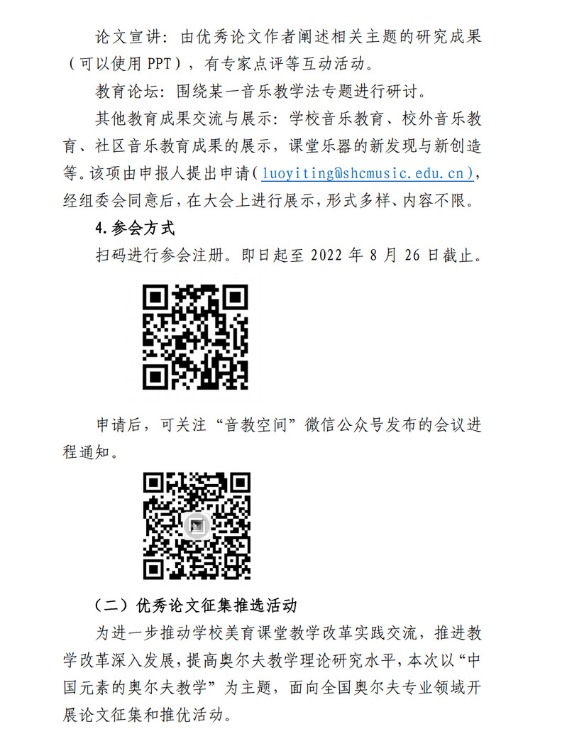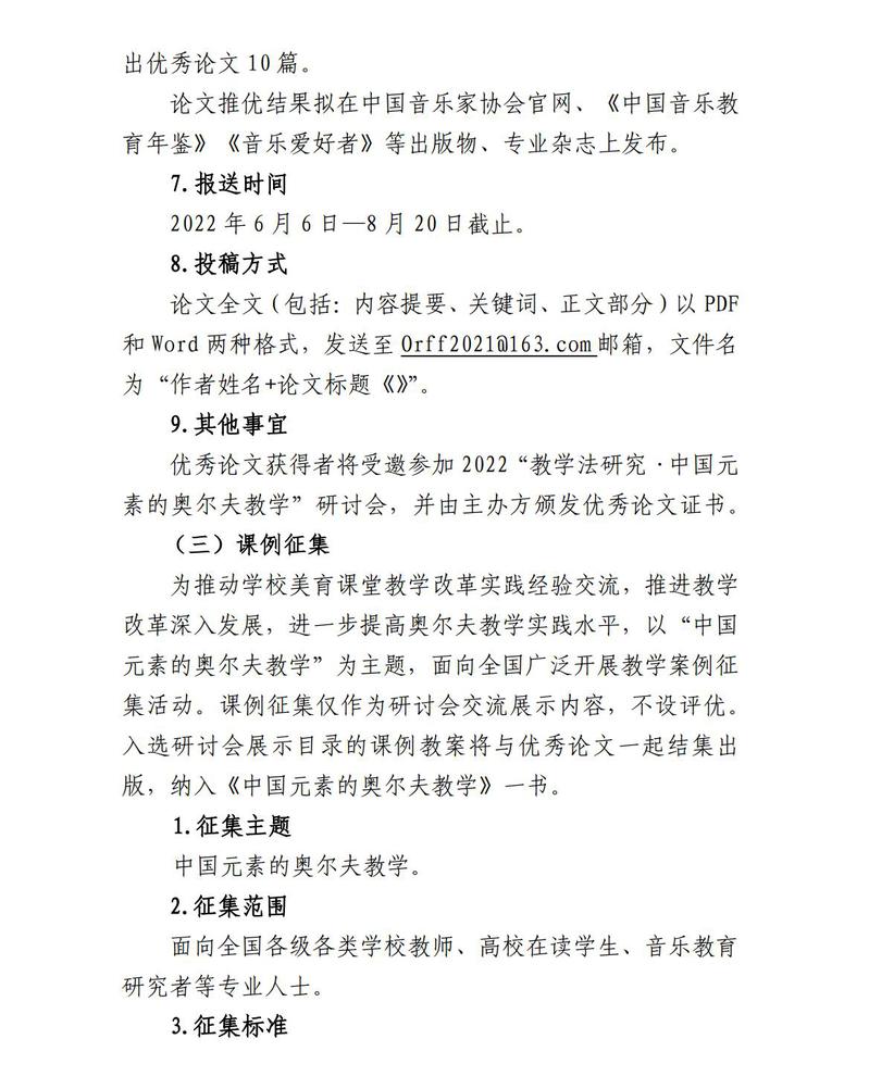 同时,为进一步推动学校美育课堂教学改革实践交流,推进教学改革深入发展,提高奥尔夫教学理论研究水平,本次以“中国元素的奥尔夫教学”为主题,面向全国奥尔夫专业领域开展论文征集和推优活动。主办方组织专家设立审核小组进行集中遴选,坚持以科学性、公正性、严肃性、权威性为原则,拟从报送论文中推出优秀论文10篇。