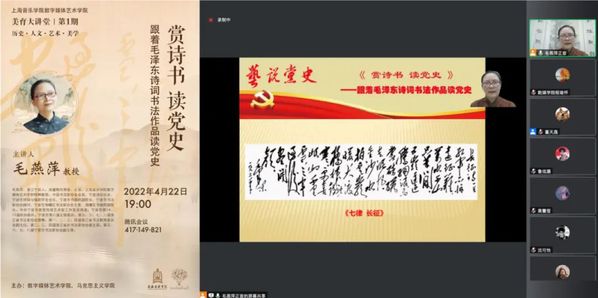 数媒学院美育大讲堂以实现“以美育人、以美化人、以美培元”为教育目的,以全面培养学生的人文素养和美学修养。4月22日学院美育大讲堂第一期邀请了宁波书画院副院长毛燕萍教授以“赏诗书、读党史”为主题,以11首毛泽东同志的诗词、书法作品,通过对诗词、书法作品的赏读,带领学生感受一代伟人在中国革命艰难岁月中表现出来的革命现实主义和革命浪漫主义精神,形象生动地展现了中国共产党波澜壮阔的史篇,以此激励师生不忘初心,牢记使命,共同为实现中华民族的伟大复兴而努力。相信经过持续的建设,“美育大讲堂”美育教学课程内容所蕴含的育人价值必将作用于学生的心灵深处,并逐渐塑造提升自身高尚深厚的文化教养。