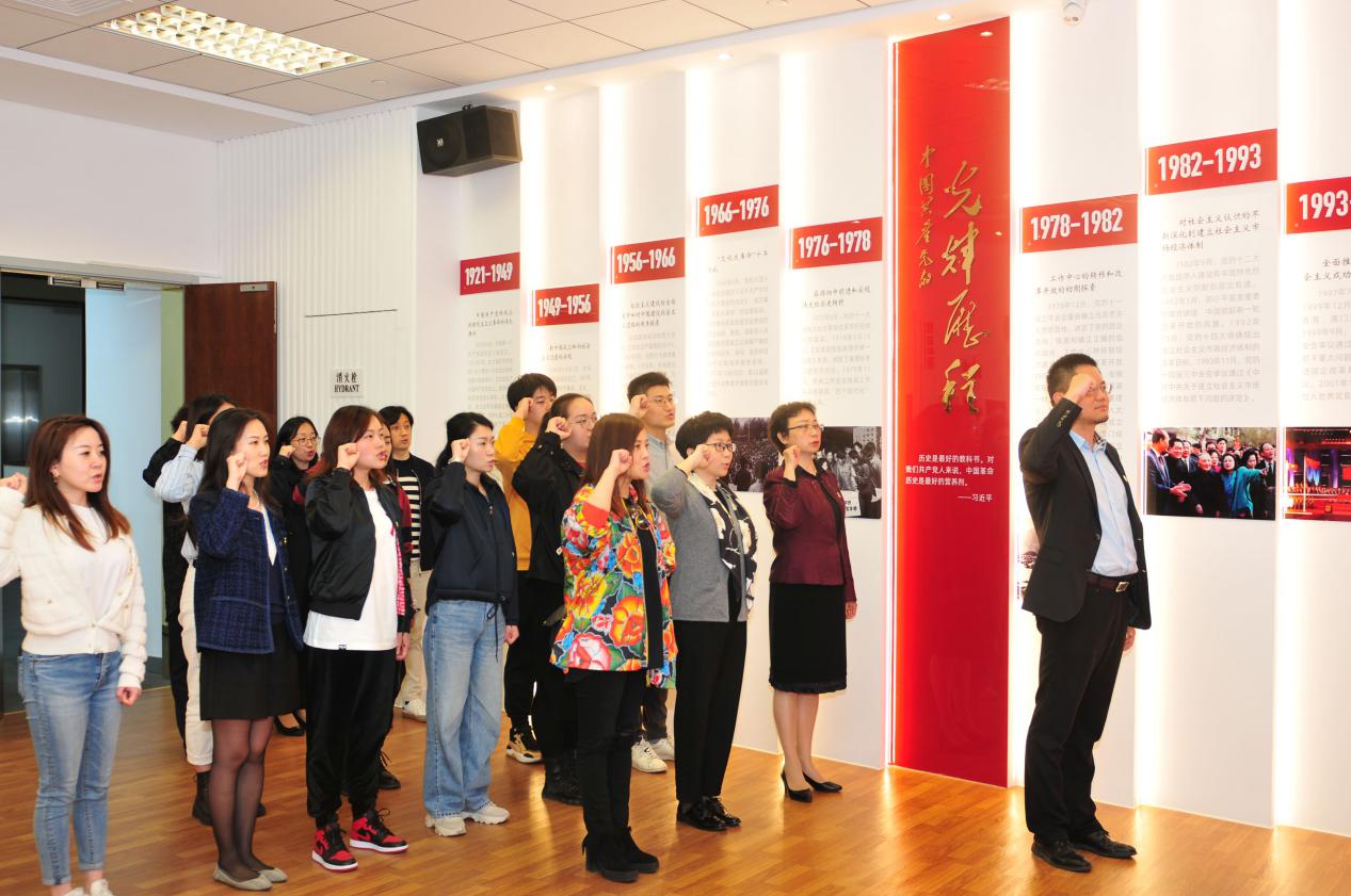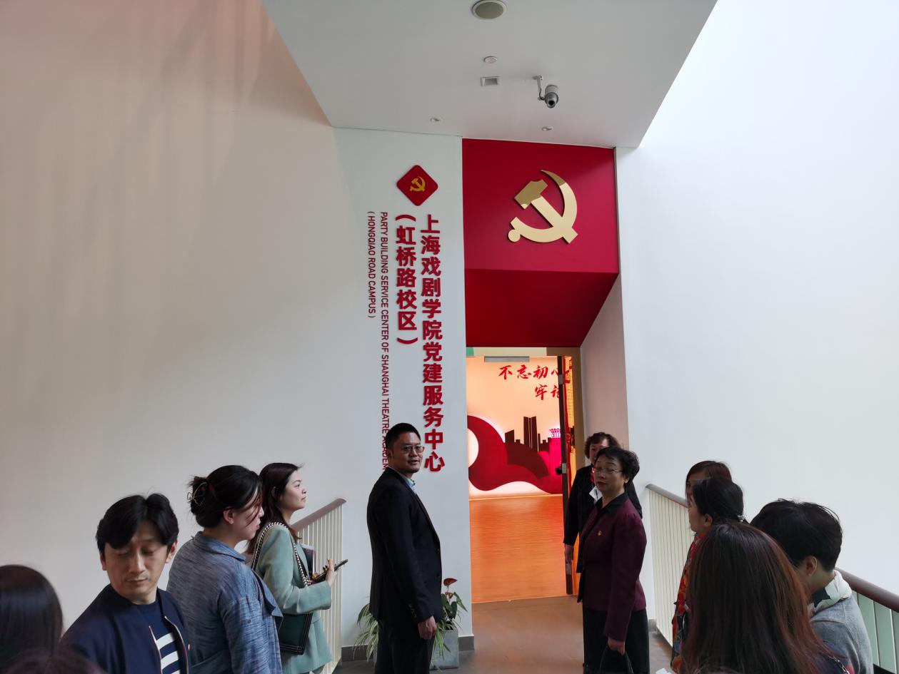 在上戏舞蹈学校康路副书记带领下,大家进入了上海戏剧学院虹桥路校区党建服务中心。中心不大但很精致,有宣誓栏、红色舞蹈基地展示、党员公示栏等,taptap点点党员师生在民族音乐系党支部副书记(主持工作)、副系主任刘灏的带领下面对党旗庄严宣誓,大家表示:重温初心,牢记使命,积极工作,争做贡献!