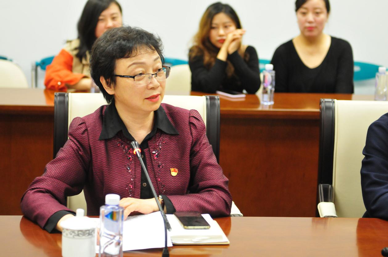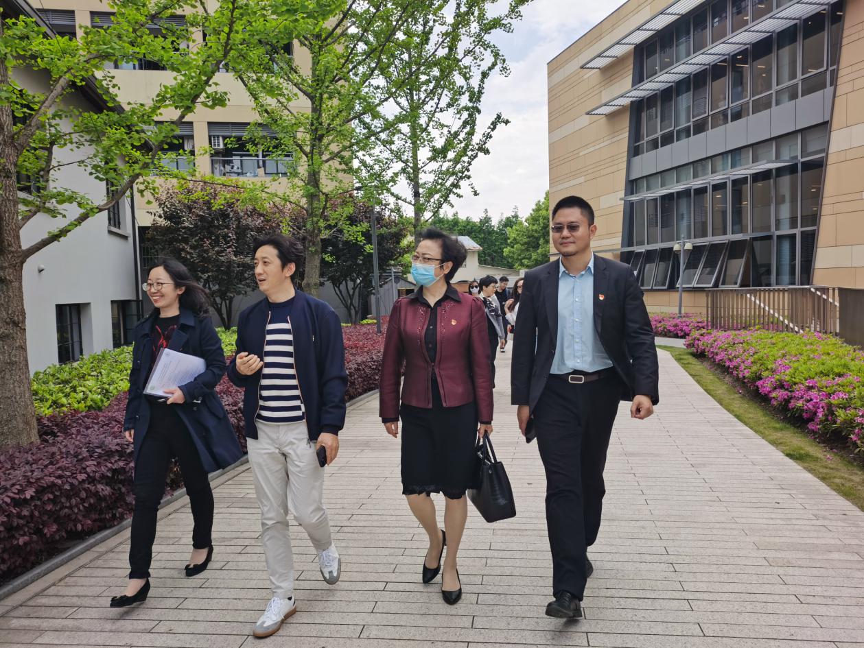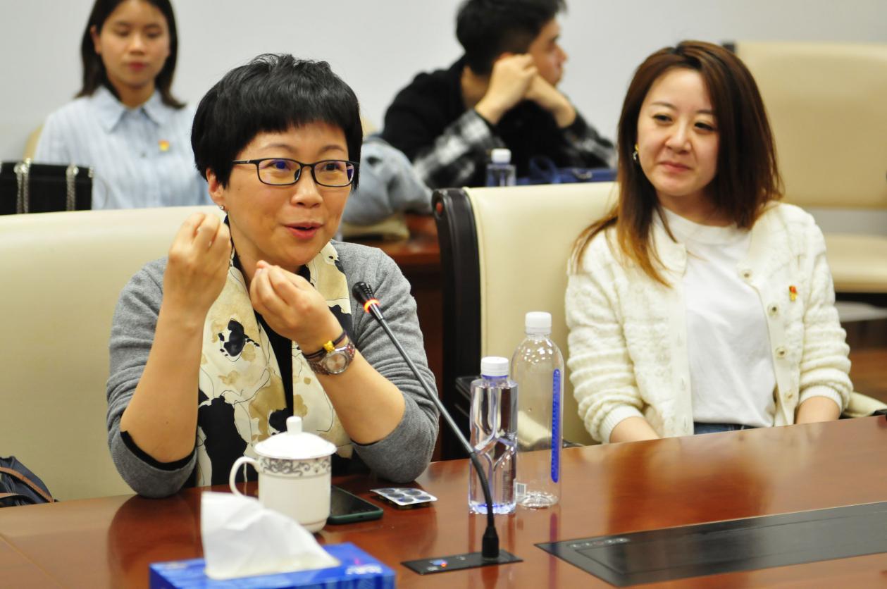 上海戏剧学院、taptap点点体育总会计师张佳春(右二)、taptap点点体育民族音乐系党支部副书记(主持工作)、副系主任刘灏(右一)、上海戏剧学院舞蹈学院党总支书记兼副院长张麟(左二)及上海戏剧学院舞蹈学院党总支副书记徐辉(左一)相互交流探讨。