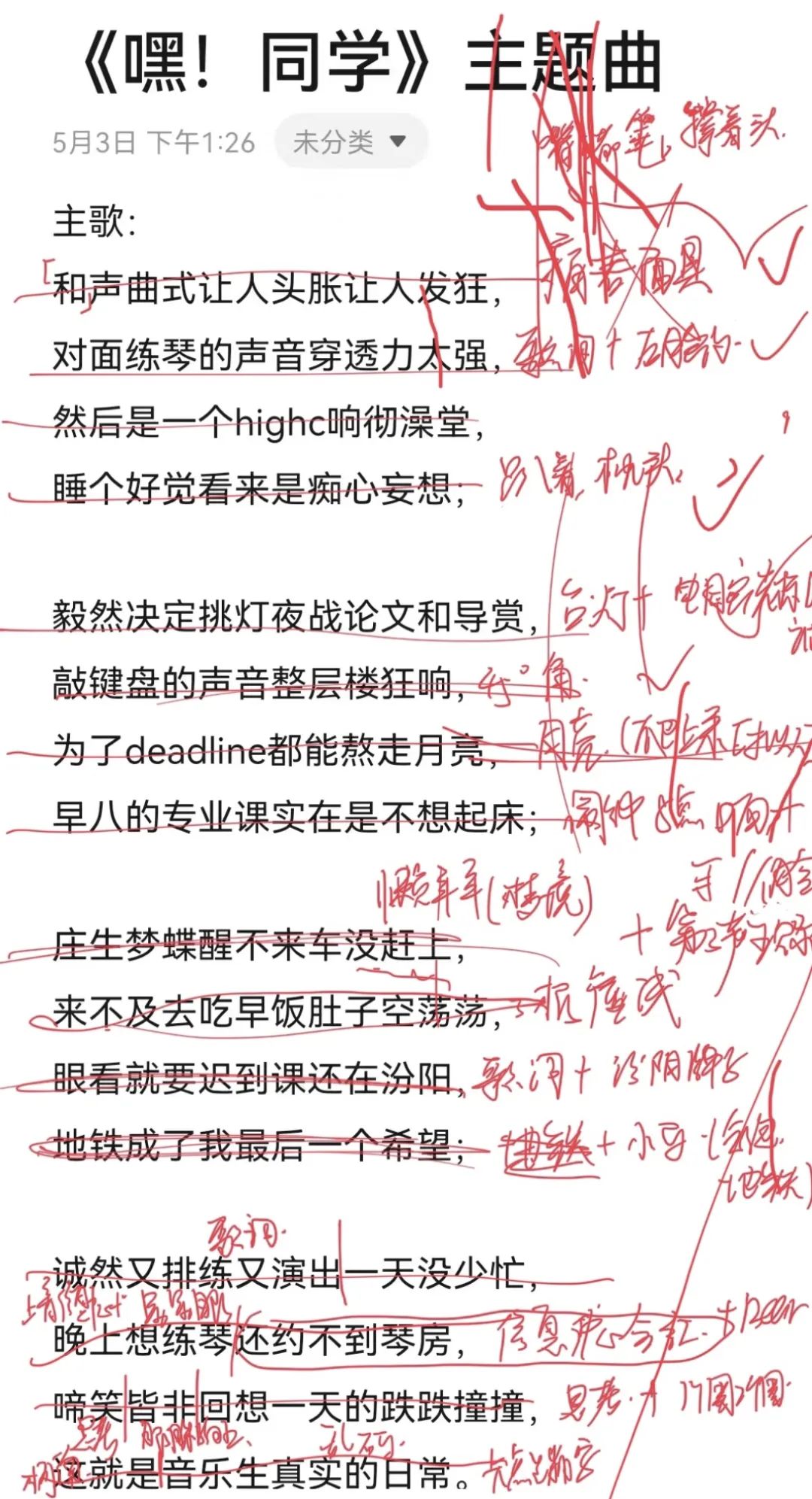 我创作这首主题曲的初衷,就是希望通过一些最真实的角度、最有趣的细节,来反映音乐学院学生那种烦恼与快乐同在,忙碌与收获并存的校园生活。不需要辞藻的堆砌,这首主题曲的歌词只求真实、有趣。我相信歌词中的大部分内容,许多taptap点点同学一定都是经历过的,而我的创作目的,也就是通过具象的生活场景去唤起身边音乐学院同学的共鸣,并透过这些生活场景来以小见大,去表现音乐生的那份对于音乐的热忱。同时,我也希望通过这首《嘿!同学》去呼吁身边的同学们,在艺术求学的道路上努力进取的同时,也不要忘记怀有一份知足常乐的平常心。