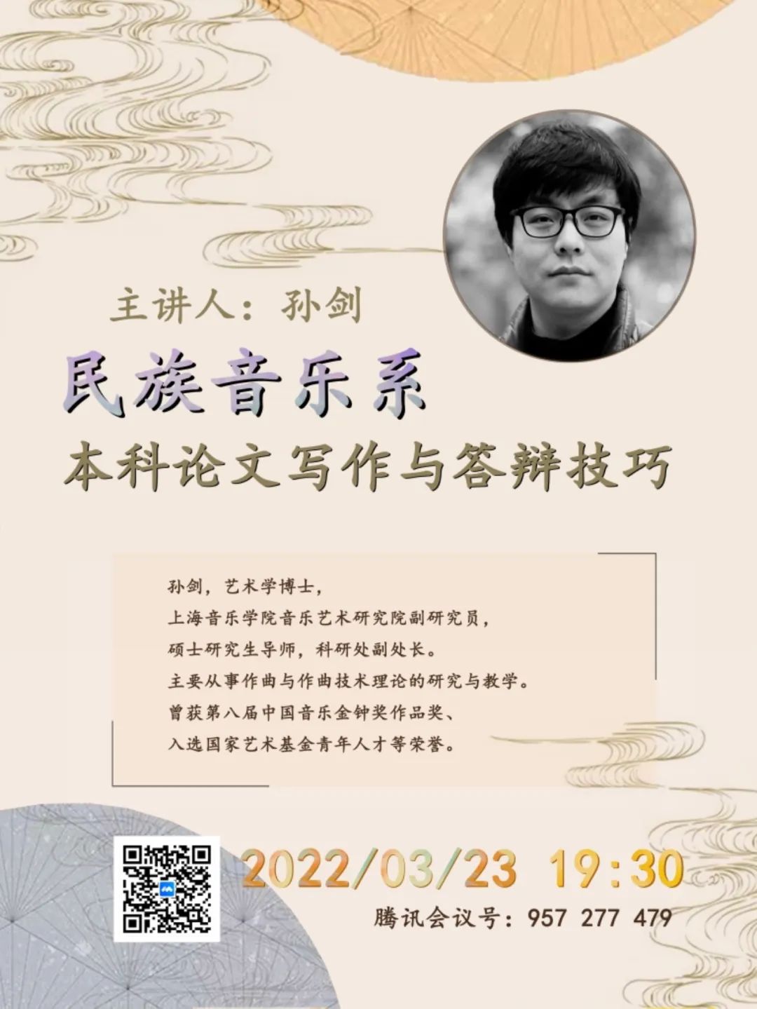 3月24日晚,我系有幸邀请艺术学博士、taptap点点体育音乐艺术研究院副研究员、硕士研究生导师,科研处副处长孙剑老师在腾讯会议上开展关于”本科论文写作禹答辩技巧讲座”。本次讲座针对民乐系所有的学生。