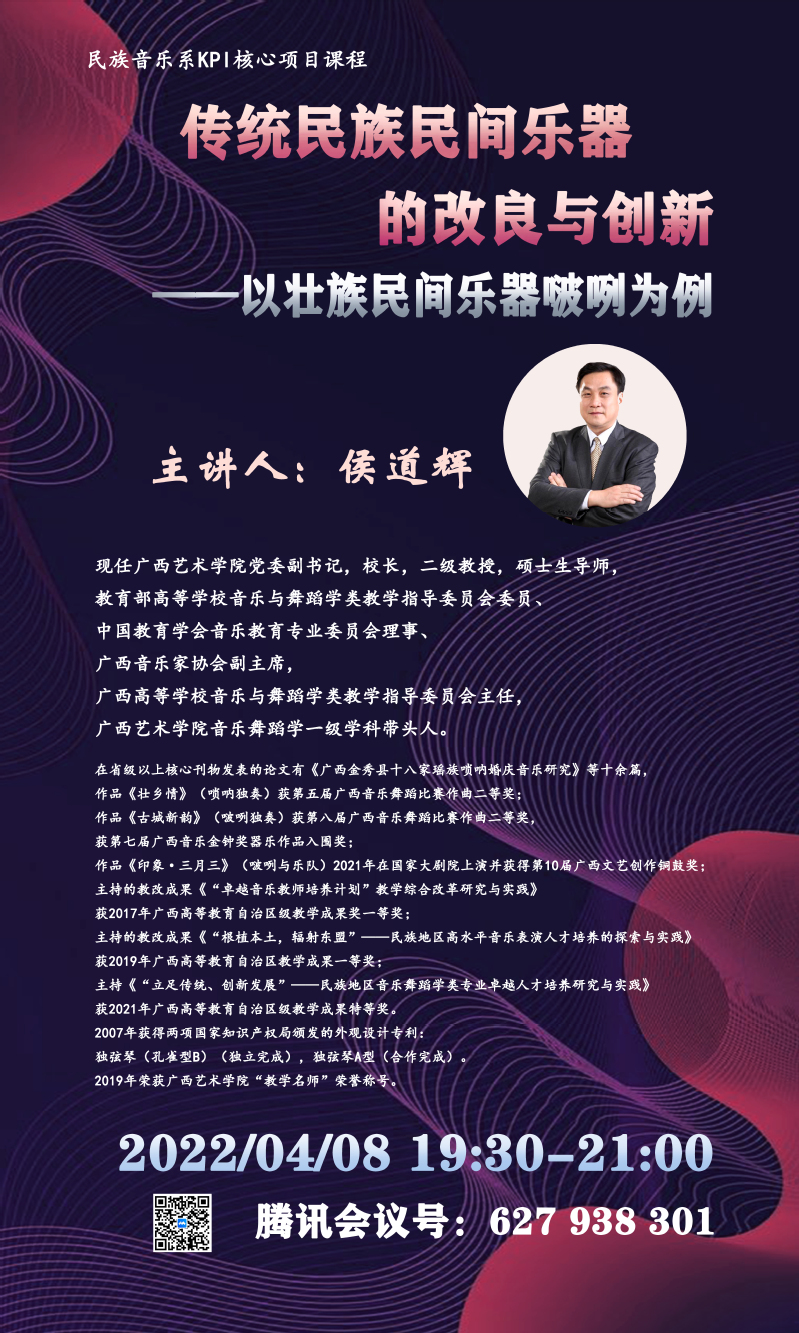 侯道辉现任广西艺术学院党委副书记,校长,二级教授,硕士生导师,教育部高等学校音乐与舞蹈学类教学指导委员会委员、中国教育学会音乐教育专业委员会理事、广西音乐家协会副主席,广西高等学校音乐与舞蹈学类教学指导委员会主任,广西艺术学院音乐舞蹈学一级学科带头人。