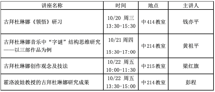 随着古拜杜琳娜国际声誉的日渐提升,世界各地的学者都对其进行了较多学术性研究,举办了较多学术研讨活动。今年恰逢古拜杜琳诞辰90周年(2021.10.24),届时喀山和莫斯科都将举行专场纪念活动和音乐会,中国西方音乐学界也应给予足够重视,为此音乐学系联合作曲指挥系,并邀请了国内相关研究专家,在10月18日-22日举行“古拜杜琳娜学术研究讲座”,在庆祝作曲家生日的同时,促进国内学界对古拜杜琳娜的了解,从而进一步推动对其作品的深入研究。