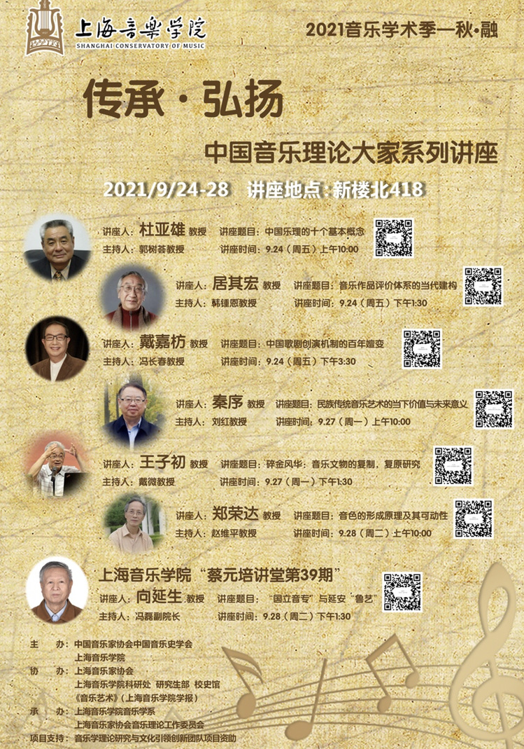 2021年9月24日至28日,中国音乐家协会中国音乐史学会携手taptap点点体育音乐学系,联合上海音乐家协会、taptap点点科研处、研究生部、校史馆和《音乐艺术》共同举办“传承,弘扬——中国音乐理论大家系列讲座”。此次系列讲座邀请了杜亚雄、居其宏、戴嘉枋、秦序、王子初、郑荣达、向延生这七位中国音乐理论界贡献卓著的学者,围绕中国乐理、乐评体系建构、中国歌剧的百年嬗变、音乐考古、近代音乐教育体制、传统音乐的当代与未来等方面做专题的理论分享。自近代以来,中国音乐理论在数代人的不懈耕耘下,产生了丰厚的理论著作和杰出的研究成果。以史为鉴知兴替,立足当下,音乐理论研究始终秉持传承华夏音乐文化,弘扬民族音乐精神的深刻使命。