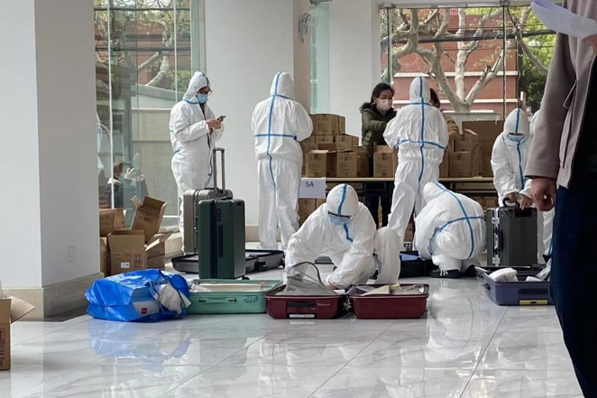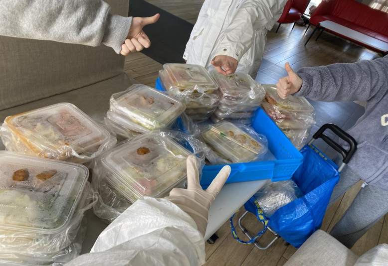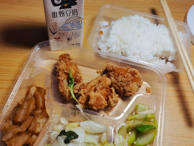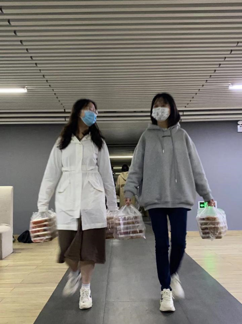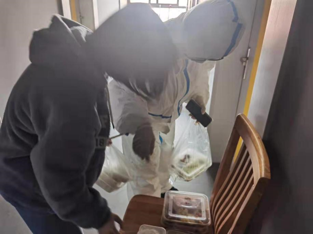 为增强防护,减少接触,采取实行了“无接触发饭法”。饭菜由志愿者放在宿舍门前的凳子上,隔空投递。在避免疫情传播的同时,传递同学间最暖心的情谊。
