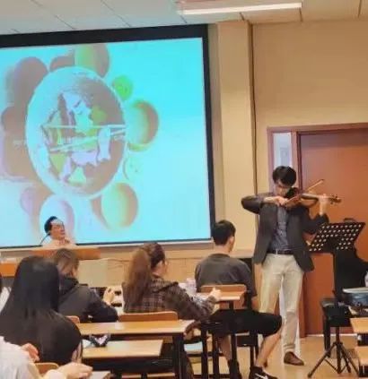 陈教授的作品以红色主题居多,部部经典。讲座中,他特别邀请邓肯和秦云轶两位演奏家为同学们现场演绎,并针对作品创作提出了几点建设:一是作品需符合时代的要求;二是要创作群众认可、国家需要的音乐;三是创作应融合不同的文化元素。陈教授还强调,创作最重要的是真情实感的表达。如《梁祝》,他就尝试用一个“情”字探寻人类永恒的主题;《王昭君》等作品,则是对家国情怀的诠释。这些作品都见证了陈教授60年来对生命、对美、对爱的理解与追求。