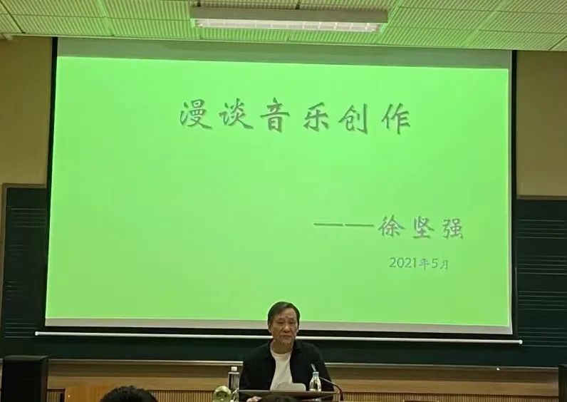 2021年5月18日,徐坚强教授在汾阳路北418教室为作曲指挥系同学举办了题为《漫谈音乐创作》的讲座。陈牧声教授主持开场,阐明了本场讲座在实践周系列讲座承前启后的意义。有限的1个半小时里,徐坚强教授结合多年音乐创作的心得收获进行分享。