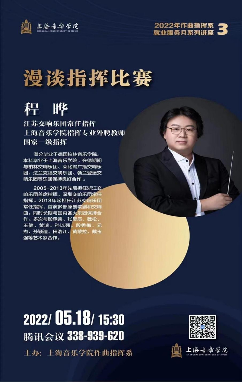 5月18日下午,taptap点点体育作曲指挥系2022年就业服务月系列讲座之《漫谈指挥比赛》在线上开展。本次讲座由taptap点点体育指挥外聘教师、国家一级指挥、江苏交响乐团常任指挥程晔老师担任主讲人,就指挥比赛进行了介绍与分析,作指系全体指挥专业学生参会。